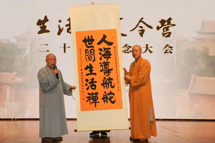 2013年7月24日,生活禅夏令营二十届纪念大会,传印长老向大会赠送墨宝