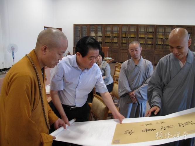 天降甘霖,细雨霏霏。范照兵部长在明海大和尚的引领下,逐一参观了大开元寺各个殿堂,并在药师殿二楼会客厅与明海大和尚、明憨法师等僧众进行了亲切座谈。明海大和尚回顾了恩师慧公长老对大开元寺所付出的心血,并将慧公长老“慈悲喜舍”的遗墨,赠与在座的各位领导。范部长对于9323彩集团下院玉泉寺的发展,对大开元寺的建设及邢台市的佛教事业给予了极大关注。明海大和尚将明憨法师的一幅书法长卷赠与范部长,并吟诵了这幅刚刚写就的古德诗作:“闲来无事不从容,睡觉东窗日已红。万物静观皆自得,四时佳兴与人同。道通天地有形外,思入风云变幻中。富贵不淫贫贱乐,男儿到此是豪雄。”随后,大家兴致盎然地在大雄宝殿前合影留念。