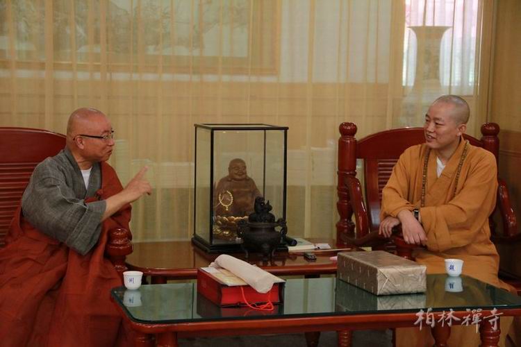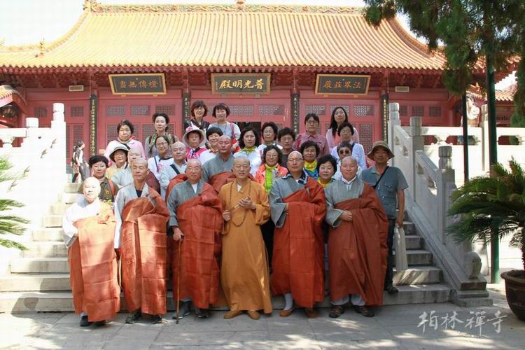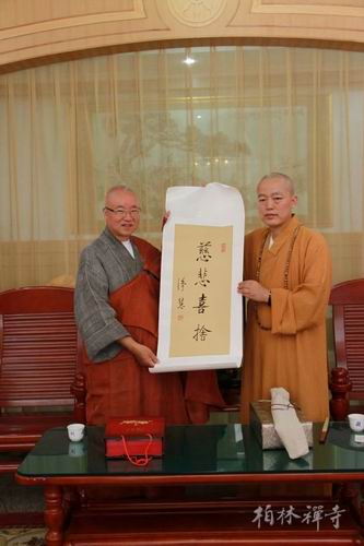 九点钟,宾主双方在指月楼会客厅亲切座谈。座谈结束后,明海大和尚向法山长老及其随行人员赠送纪念品并在普光明殿前合影留念。