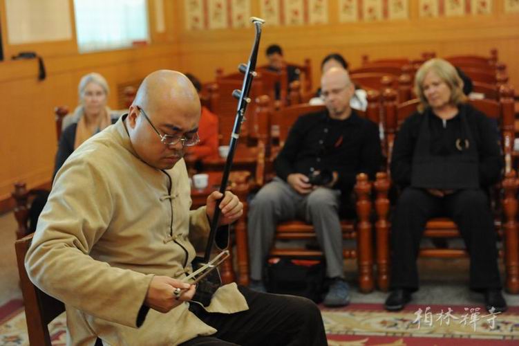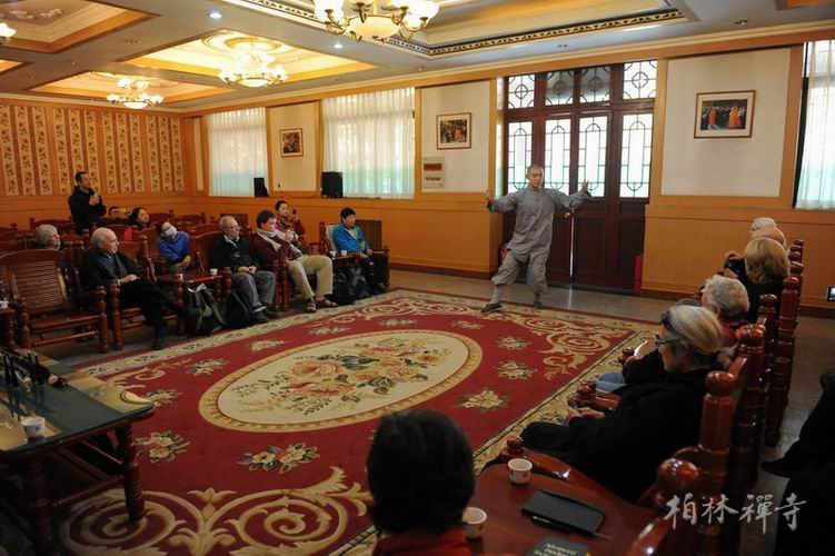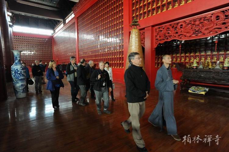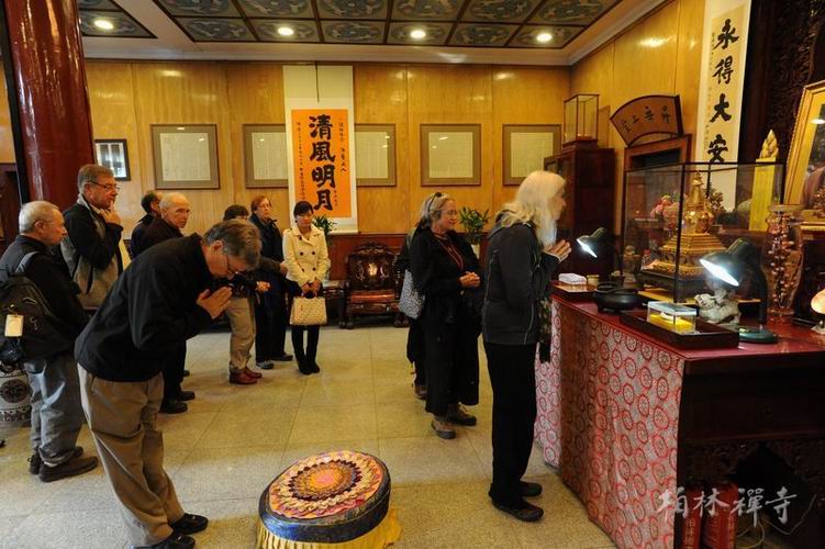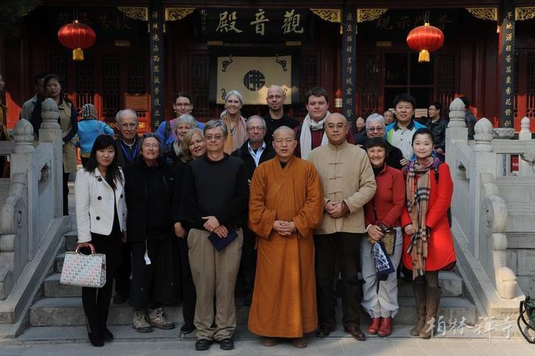 次日上午,传学法师带领团员坐禅;午间,明海大和尚在指月楼与参访团一行进行了两个多小时的英文座谈。期间,大众还欣赏了二胡演奏和太极拳表演。座谈结束后,大家互赠纪念品并在观音殿前合影留念。