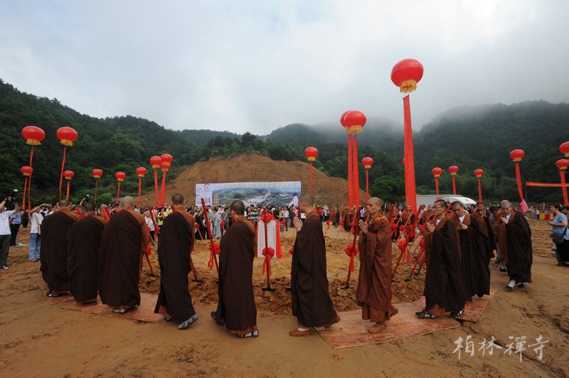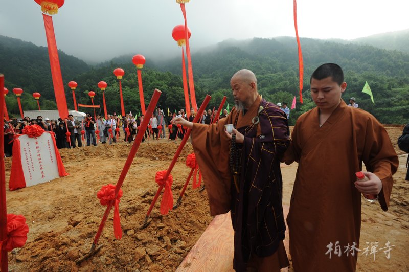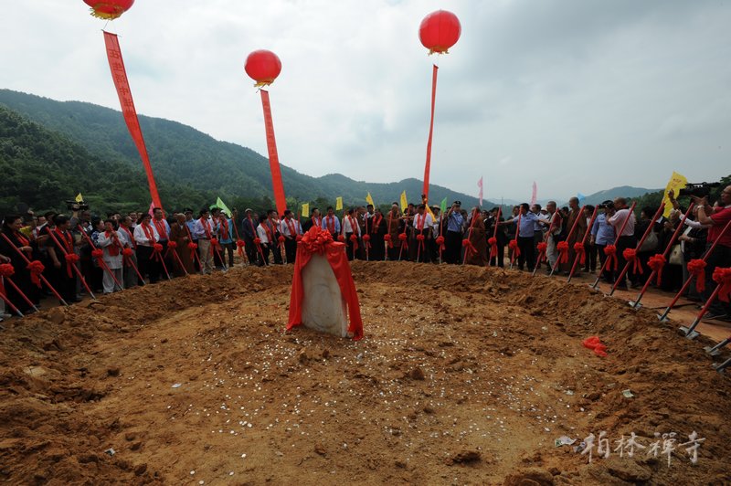 九时三十分,与会嘉宾共同环绕在奠基石周围,净慧老和尚宣说奠基法语毕,大家共同为禅宗佛祖大金塔奠基。