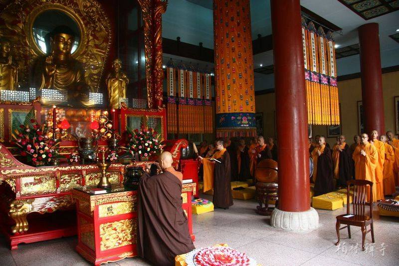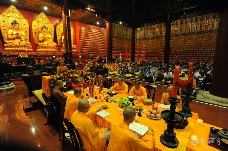 是时,寺院内供奉五味茶果,香灯严净。上午9时,两序大众云集万佛楼,欢喜奉行盂兰盆法并虔诵《盂兰盆经》,敬设盂兰盆供;中午12时30分,礼请监院明影法师为近千名信众传授了三皈、五戒;入夕,四众佛弟子在万佛楼设《瑜伽焰口》一堂。以法会之力供养十方自恣僧,报答双亲养育之恩,救拔七世父母离恶道。