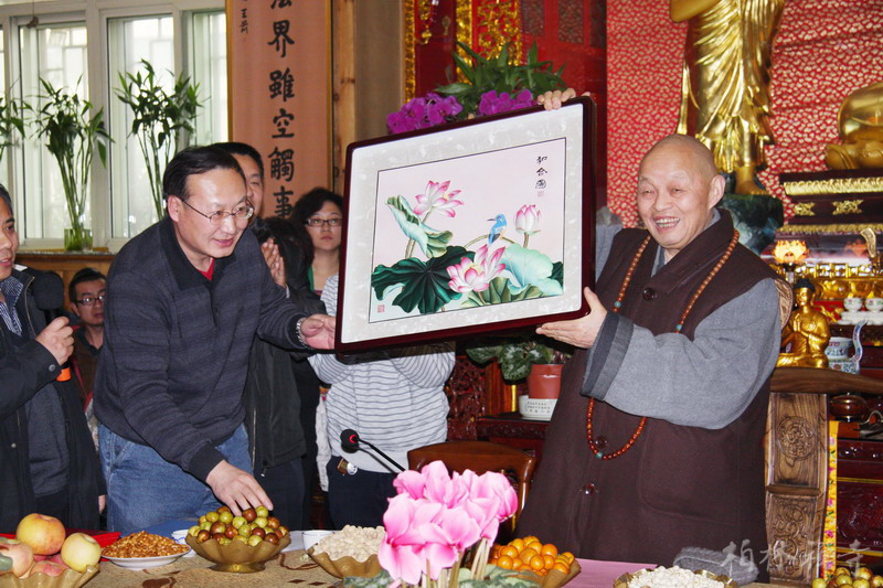 省民宗厅一处的赵明宇处长代表丰宁县委县政府向河北省佛教协会赠送国家级非物质文化遗产“腾氏布糊”——和合图,感谢省佛协在“百寺帮百村”活动中对丰宁县人畜饮水工程的大力支持。