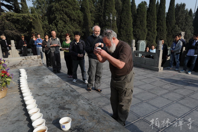 4月12日下午,明影法师带领美国客人朝礼祖师塔并亲切座谈,晚间,冯克强先生为大家做关于禅茶知识的讲演。