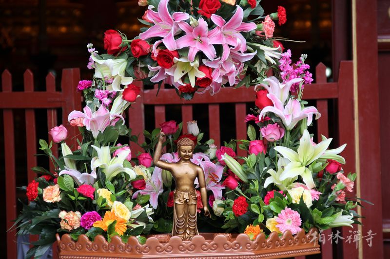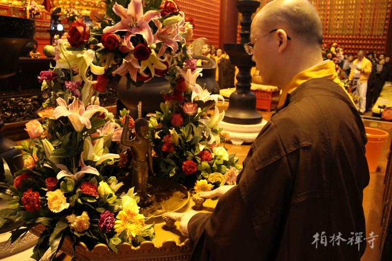 清晨,万佛楼内灯火辉煌,两千名信众在这里参加了隆重的浴佛仪式。之后,成千上万的佛弟子冒雨前来浴佛。万佛楼前人头攒动,人们在圣号声中以鲜花净水灌浴太子佛像,天雨花香,因缘殊胜。