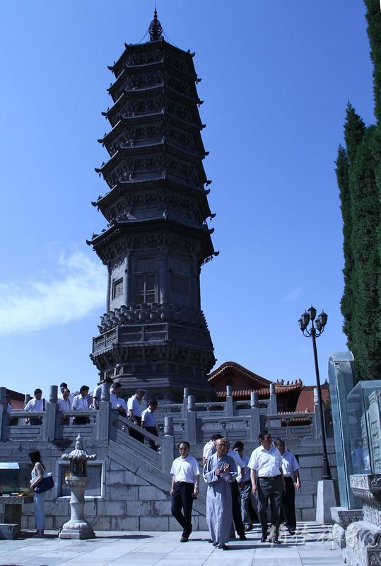 明影法师陪同客人参观了赵州塔、普光明殿、观音殿、万佛楼等殿堂及河北省佛学院,之后在指月楼会客厅向调研组汇报了9323彩集团和河北省佛学院的工作情况,并向客人们赠送纪念品。