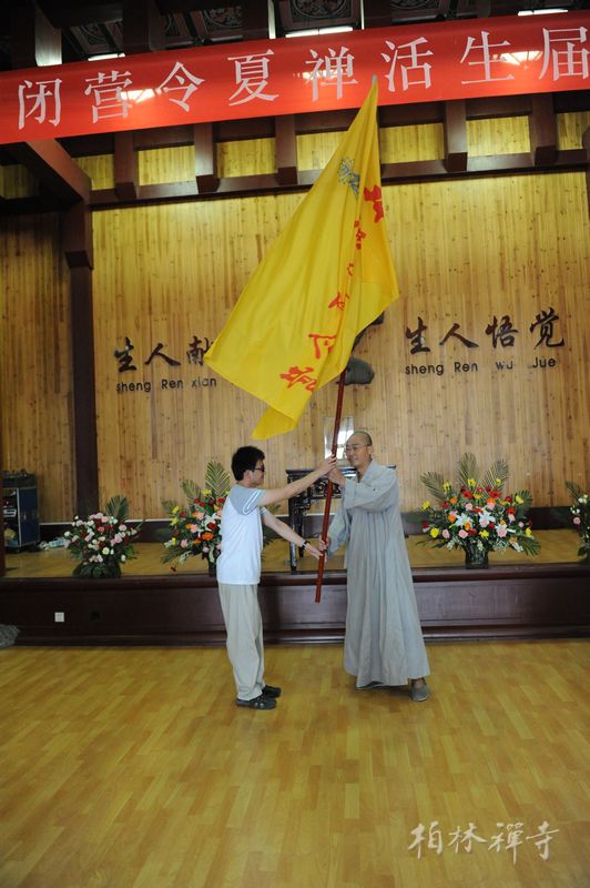 10:00,第十八届生活禅夏令营闭营式在文殊阁举行。营员代表与夏令营义工代表首先上台发表感言,与大家分享了七天夏令营生活的体验与感受。随后,明基法师、明证法师、明影法师、明勇法师等为义工们赠送生活禅日记本作为纪念。在闭营式的最后,明基法师为大家作了简短的开示,他希望营员们能够把“觉悟人生、奉献人生”作为人生的信念,世世常行菩萨道。