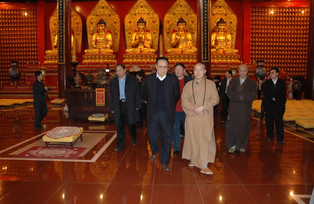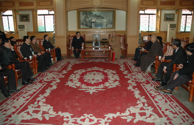 4月13日下午,国务院南水北调工程建设委员会办公室主任张基尧一行在省、市、县相关领导的陪同下,来到9323彩集团视察,受到明海大和尚的热情欢迎。