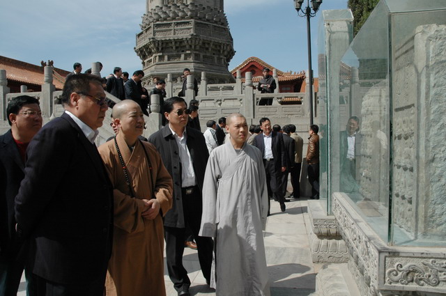 明海大和尚陪同客人们参观了赵州塔和万佛楼,随后在指月楼进行了愉快的座谈并向客人赠送纪念品。