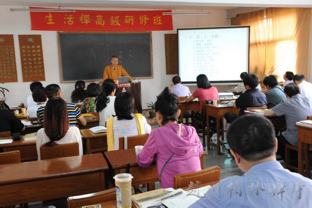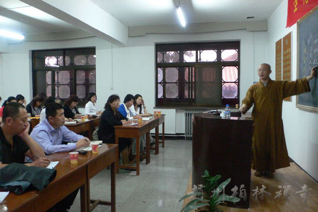 5月27日晚,观行法师为来访者介绍寺院仪轨。28日由华夏儒商国学院徐文明老师做题为《禅宗的智慧》的讲座。