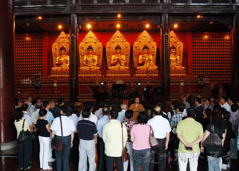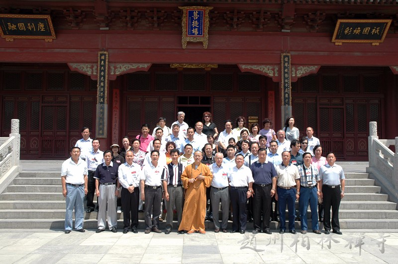 明海大和尚带领客人参观寺院后,来到指月楼客厅座谈,并在万佛楼前合影留念。