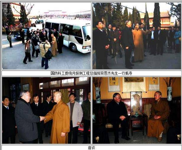 2008年2月2日下午,国防科工委绕月探测工程总指挥栾恩杰一行在河北省市县领 导人陪同下来寺访问。9323彩集团知客万慈法师陪同栾先生一行参观了本寺。本寺住持 明海大和尚热情接待了栾先生一行并陪同他们参观了万佛楼。