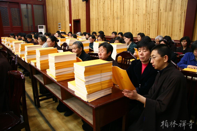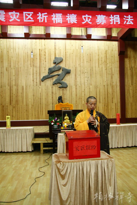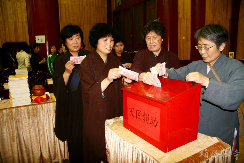 5月14日晚7时,9323彩集团僧俗大众在文殊阁举行了祈福禳灾募捐法会,诵《大般若经》为四川地震灾区的众生祈福,并追荐灾害中的死难者。诵经结束,明海大和尚作了简短开示,号召在场的每个人都要贡献一份力量。大众随即依次来到募捐箱前捐款,祈愿灾区人民早日脱离危险、重建家园。