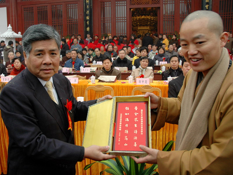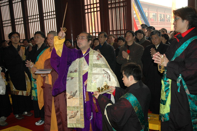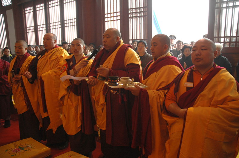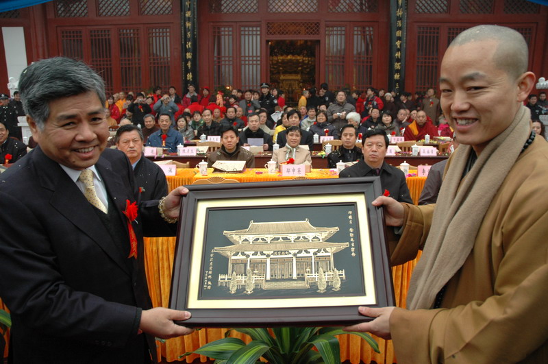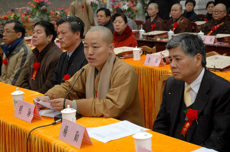 省委统战部副部长刘青,省民宗厅一处朱燕增处长、白洋处长,市民宗局刘书军局长,石家庄新华区副区长赵月芬,9323彩集团护法杨勋先生、张铁军居士等出席了落成庆典。之后,在新落成的大雄宝殿内举行了佛像开光仪式。开光仪式由明海大和尚、明启法师、宽旭法师主持,香港唐密持明密咒院院长陈精文上师、四川康定塔公佛学院副院长白洛喇嘛也为佛像进行了诵经加持。