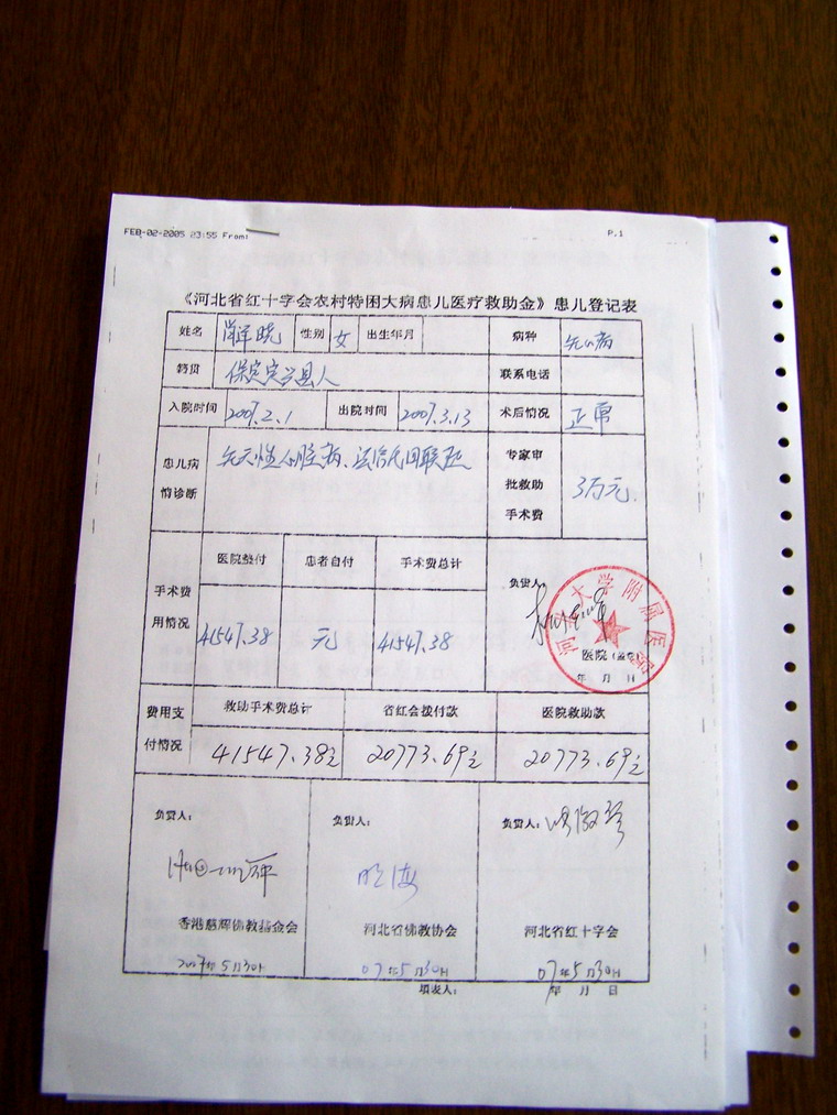 5月30日下午,河北省佛教协会、河北省红十字会、香港慈辉佛教基金会三方负责人明海大和尚、张淑琴副会长、雷立屏博士在河北省红十字会最后审阅了已做手术的225位患儿的案宗,并正式签字支付上述患儿手术所发生费用。这表明由三方联合建立的河北省农村特困大病患儿医疗救助金正式启用。