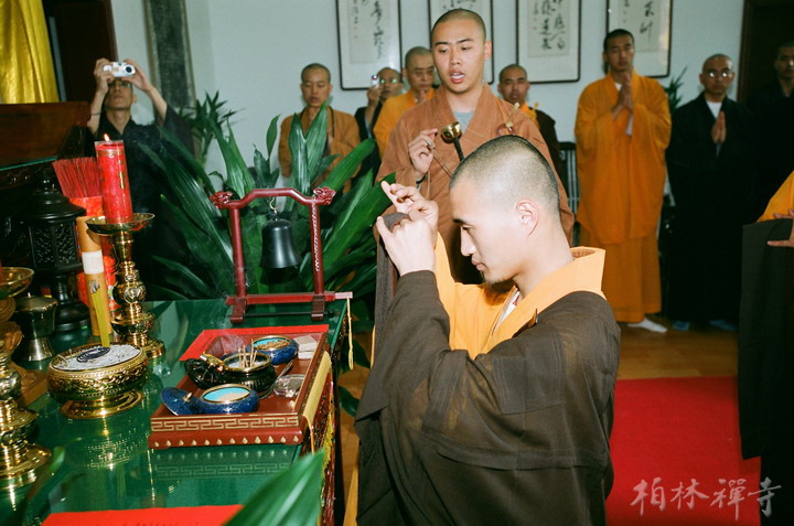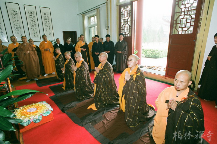 上午八时三十分,传法大典在五叶堂隆重举行。在庄严的香赞梵音中,慧公老和尚拈香升座,六位接法禅人拈香、展具,顶礼三拜,长跪合掌,聆听慧公老和尚宣说法语。宣法语毕,由维那师代六位接法禅人宣求法词,恳请临济宗第四十四代上本下宗慧公老和尚曲垂方便,付法传衣,俾心灯永续,祖道昌隆……宣求法词后,六位接法禅人向老和尚顶礼三拜,之后依次至老和尚座前问讯、接祖衣、披衣,至香案前拈香,展大具,长跪合掌。