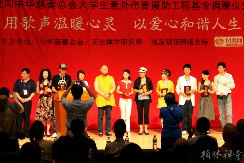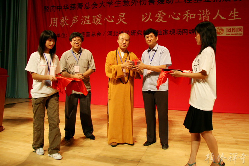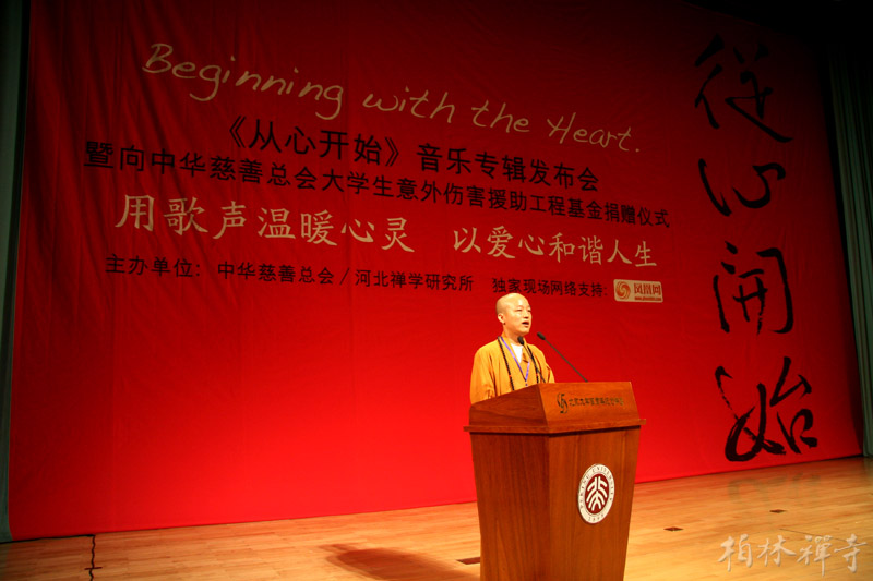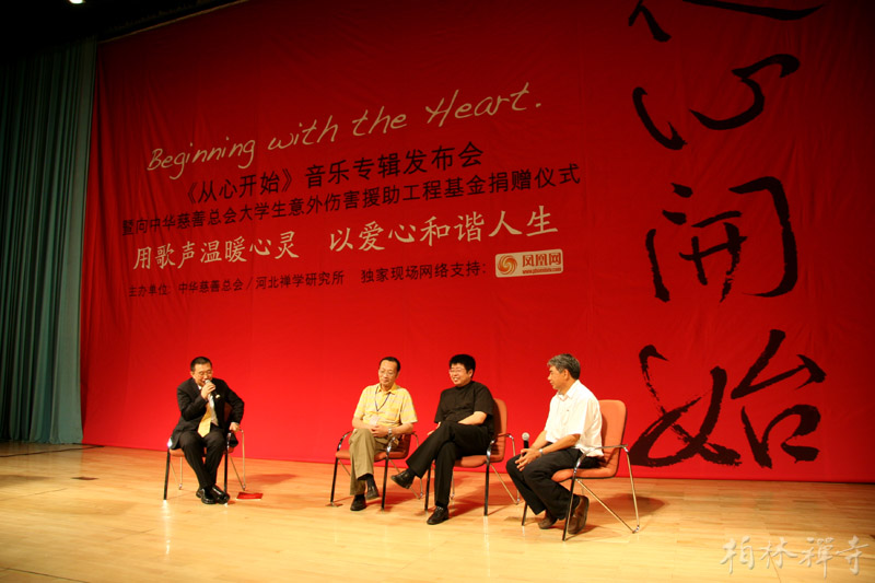 9月8日晚7:30,由河北禅学研究所和中华慈善总会联合主办的《从心开始》音乐专辑首发式暨慈善捐赠式在北京大学百年讲堂二楼多功能厅举行。佛教界、文化界、演艺界及北大师生共三百多人出席了这一文化公益活动。晚会上,明海大和尚代表河北禅学研究所将《从心开始》专辑首版一万张捐赠给中华慈善总会下属的“大学生意外伤害援助工程基金”,常寒婴先生代表中华慈善总会接受了捐赠。