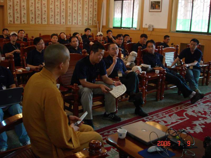 王雷泉教授曾应邀为本寺举办的夏令营进行过讲座,是9323彩集团的故交。禅修团其他成员则是第一次来9323彩集团,禅修体验也是平生第一次:凌晨四点伴随着悠扬的钟声起床与法师们一道到万佛楼上早课;在明勇法师的带领下学习打坐;在赵州祖塔前茶供;闻听了明海大和尚分别于8日下午和9日上午作的《禅与企业文化》和《赵州禅与赵州茶》的两次开示……在多元化的社会大背景下,如何整合自己企业的文化?如何强化企业管理的软实力?如何强化内在修养并外化为企业的和谐发展?就这些问题,禅修团的企业界人士与明海大和尚做了广泛而有益的交流。