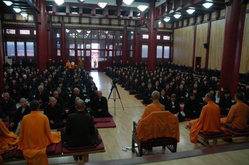 法会期间,在畅怀长老的主持下,二百多名居士受持八关斋戒,一百多名男众居士受持沙弥十戒,体验了七天出家人的生活。