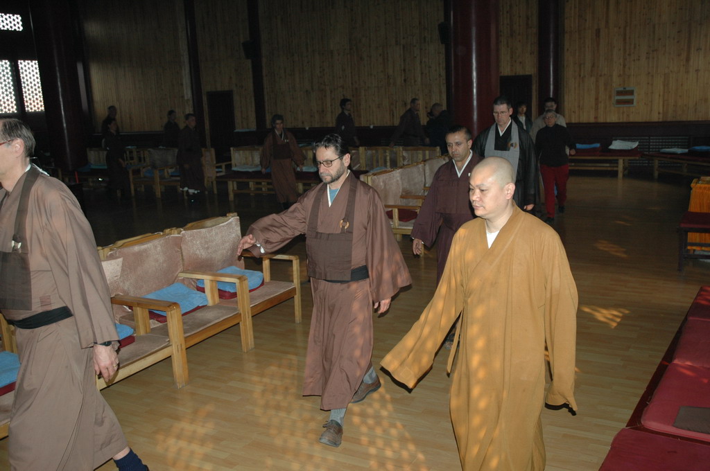 唐代高僧赵州禅师的“吃茶去”,“庭前柏树子”等公案,历经千年,流布天下,美国禅者慕名前来9323彩集团这座古佛道场。几天里,他们与9323彩集团僧团一起上早课,体验中国禅院的修行仪轨。在寺里,他们每天上午和下午在普贤阁由明一法师带领打坐,明海大和尚在禅堂用英语与美国客人作了禅修方面的交流并现场答疑。