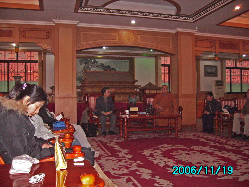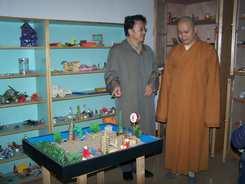 19日上午,明勇法师在指月楼和大家进行了座谈。随后同学们来到万佛楼内参观并念诵《心经》。下午,参观赵州祖师塔后,来到河北省佛学院,张教授进一步丰富了箱庭室的设施,同时进行指导。