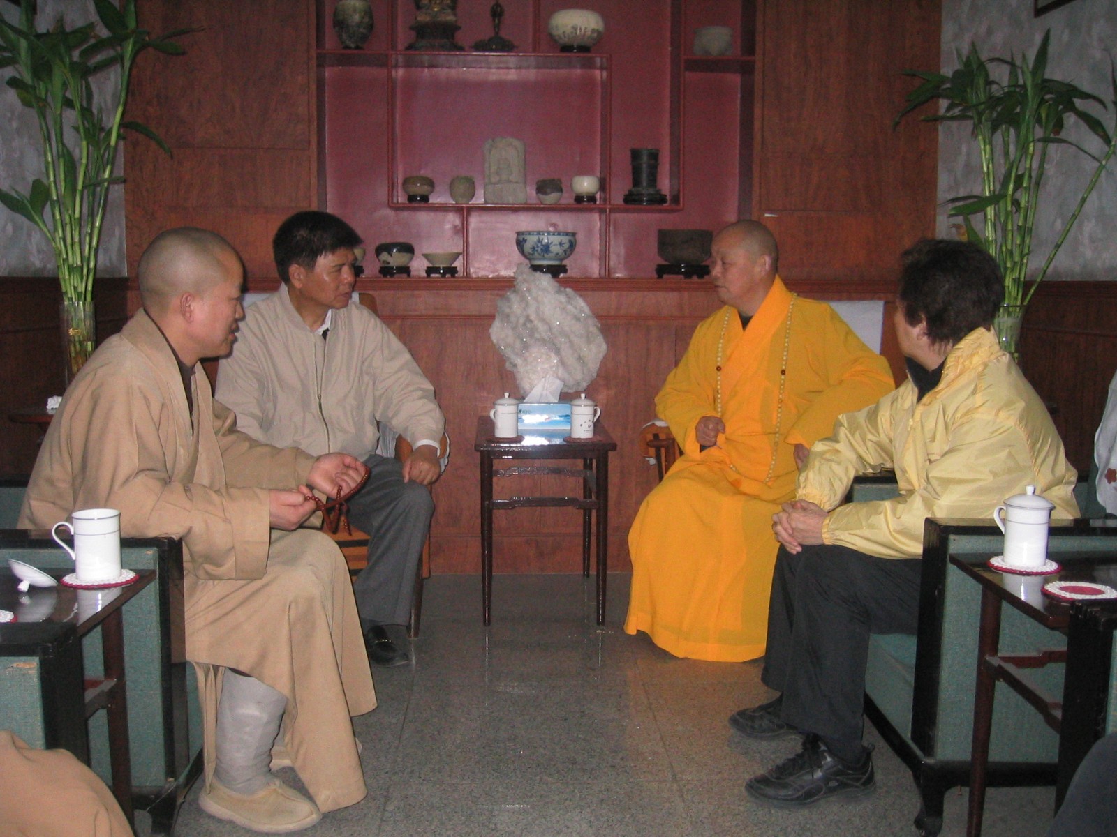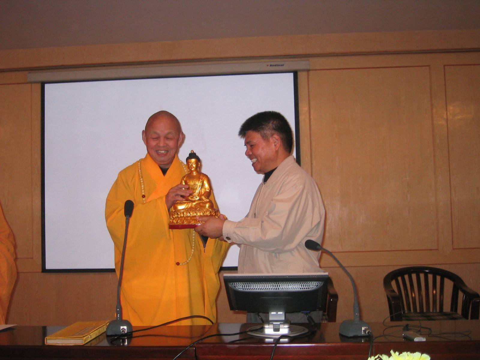 净慧老和尚在会上向杨先生赠送了纪念品和邀请杨先生明年"五一"来寺弘法的邀请函。杨先生聘请 净慧老和尚为慈辉基金会名誉会长,明海大和尚为慈辉基金会顾问。