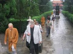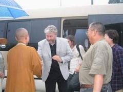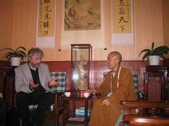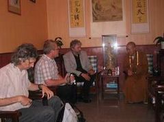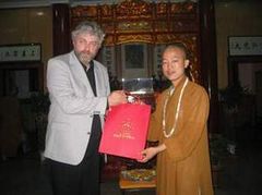 下午3:00,代理住持明海法师、知客利生法师等冒雨到山门口迎接Lothe先生的到来。在方丈寮客厅,明海法师与客人用英语进行了愉快的交谈。Lothe先生先赞叹了中午参观的省佛教协会办公楼,说给他们印象极深。明海法师说:那栋楼是在省市政府官员的直接支持帮助下买下来的,比市场价还便宜。寒暄之后, Lothe先生深情地说:上次来柏林寺了解到中国佛教发展所取得的成绩,回去后向西方世界作了介绍。这次来想了解最近几年来佛教发展的一些新情况,包括政府政策的变化。