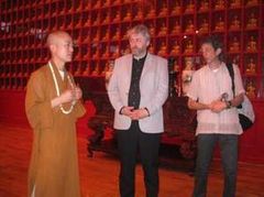 交流约四十分钟之后,明海法师陪客人到万佛楼。Lothe先生三人敬了香,他们惊叹万佛楼的雄伟、庄严,其中一位以摄像机认真拍摄了万佛楼楼上楼下的全景。