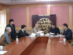 12月10日上午,明海大和尚、明杰法师、明影法师一行三人八点多便赶到了中国人民大学,九点,签字仪式顺利举行。签字仪式由张凤雷教授主持,方立天教授、明海法师、魏德东教授分别讲了话,佛教与宗教学理论研究所的专家学者和研究生十几人参加了签字仪式。仪式结束后,明海大和尚做了题为"佛教寺院的三重功能"的讲演,并就如何发挥寺院的社会功能等问题与各位学者进行了热烈的讨论。