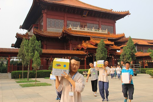上午,十几位男义工顶着烈日,到流通处把几十箱营员的衣物和书籍搬到了祖师殿。尽管路程并不长,但是由于寺院内建筑物较多,需要绕几个弯,烈日之下他们大汗淋淋。心中怀揣着对所有营员负责的精神,大家干得格外起劲,很多义工都汗流浃背,却满心欢喜。