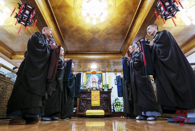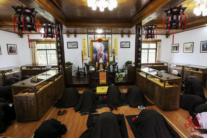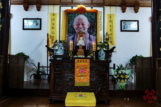 在四祖寺新任方丈明基大和尚引领下,一行人在在慧公法像前排班肃立,常住师父展具,明基大和尚引领大众向慧公法像顶礼九拜。